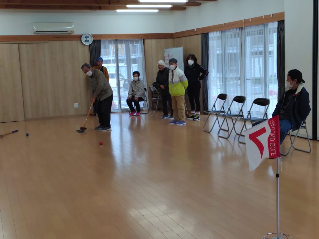 集会所の床はフローリングでボールの転がりが良く、勢いがついてホールポストを抜けて行ったり、弾かれたりしてなかなか決まらないことが多く、地団太を踏む様子がありました。凹凸の土の上とは違った難しさがあったようです。
