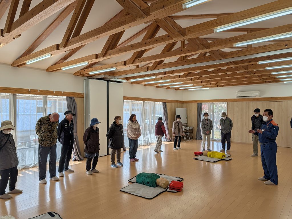 10時の避難訓練から始まり、自治会長の挨拶ののち、消防署の協力のもとで消火訓練、棟毎の消火訓練が行われ、最後に集会所内では心肺蘇生のための心臓マッサージやAEDを使った講習が開かれました。