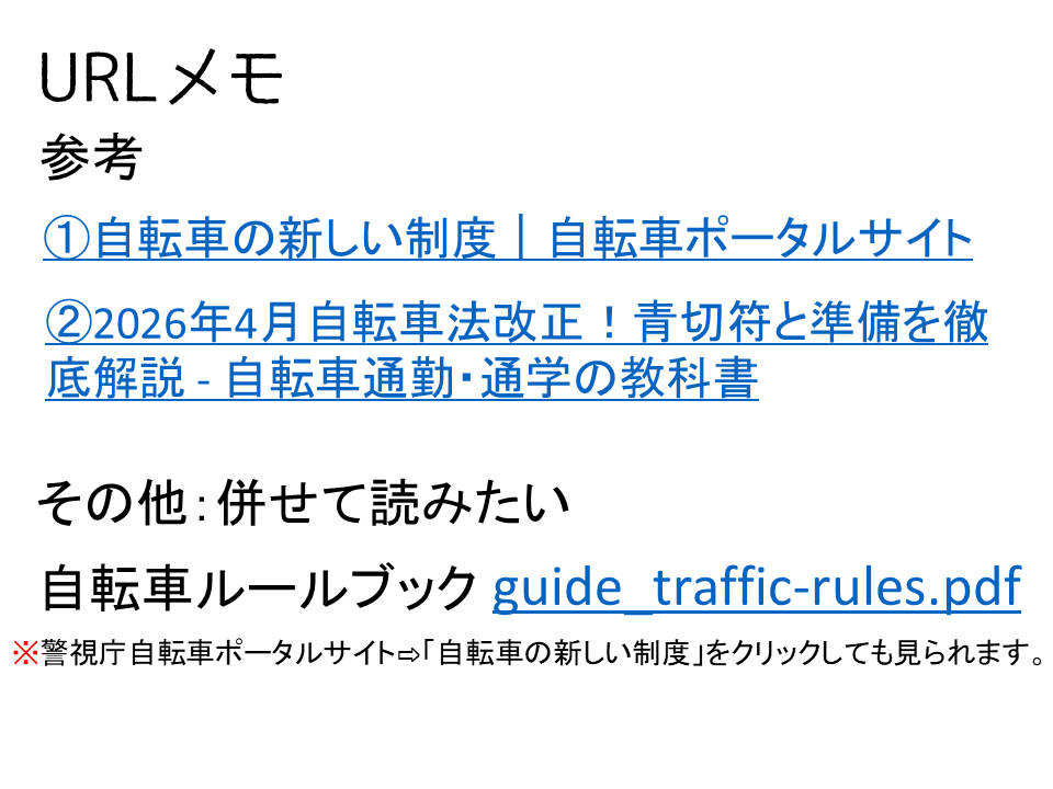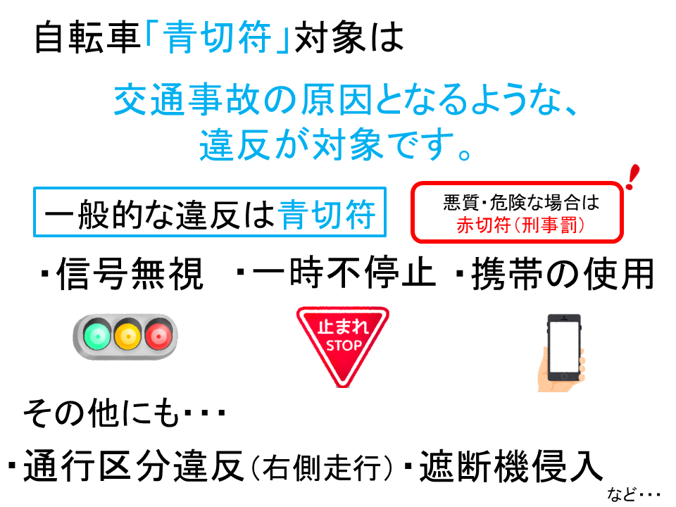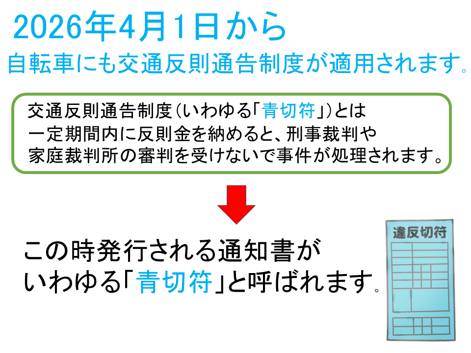 詳しくは、「自転車を安全・安心に利用するために-自転車への交通反則通告制度(青切符)の導入-(自転車ルールブック)(PDF)」を閲覧ください。
