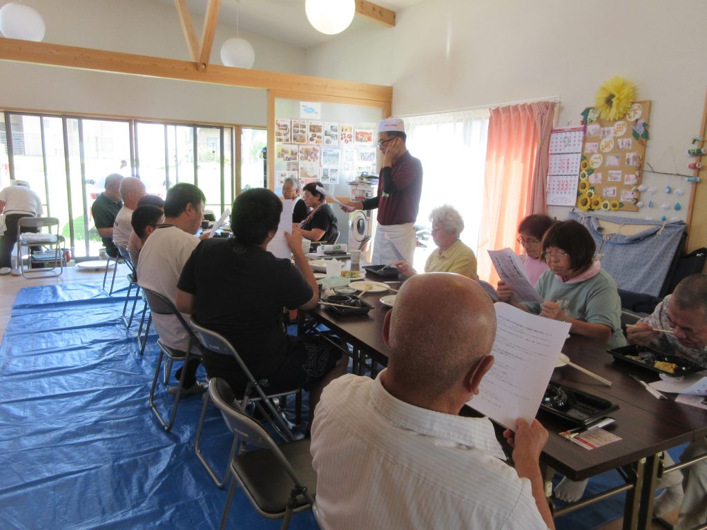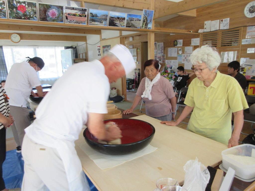 七宝会によるそば打ちが始まると「そば打ちを始めて何年?」「そば打ちの道具は自前なの?」「今日はどこのそば粉を使っているの?」、などの質問があったり、そば打ちを見学しながら隣りに座った住民さん同士で「久しぶりだね。元気だった?」、「毎日暑いね~」、「お散歩中にお会いするわよね」などたくさんの交流が見られました。