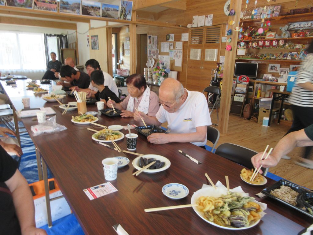 住民さんが天ぷらを揚げてきてくださったり、お漬物の差し入れがあり、できたての蕎麦と皆さんの笑顔がプラスされ、とても賑やかな食事会となりました。
