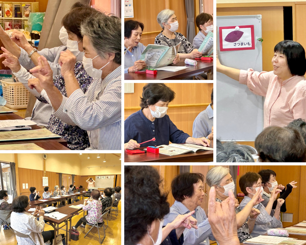 講師は、すっかりメンバーの皆さんと仲良しの高田利絵子先生♪ 今回も、脳トレ要素のある運動をはじめ、ペアで協力するゲーム、季節の話題や楽器を使ったイントロクイズなど楽しさ満載のプログラム!後半は、全員で古関裕而メドレーなどを歌いました。イントロクイズは初めてでしたが、答える前に「サウンドブロック」を鳴らすという楽しいルールがあり、控えめに鳴らす方、思いっきり鳴らす方など、小さなところにもメンバーの個性が出ていてとても面白かったですね!また次回も楽しみです♪♪