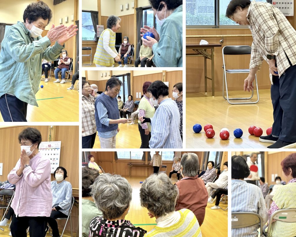 この日は朝から強い雨に見舞われましたが、ほぼ全員のメンバーが集会所に集結!「こんな雨でもやるわよ!」と気合十分のご様子でした。ほぼ全員に近いメンバーが集まったため、複数のチームをつくり「ボッチャ」大会が始まりました! 毎回違うチームを組んでいるにも関わらず、作戦を立ててゲームをするのが皆さん上手!どのゲームも全力です!しかも、一番新しいメンバーさんがみるみる上手になっていたり、活躍する人が毎回違うなど、変化があるのが楽しいですね! 次回はどんなゲームになるでしょうか?!
