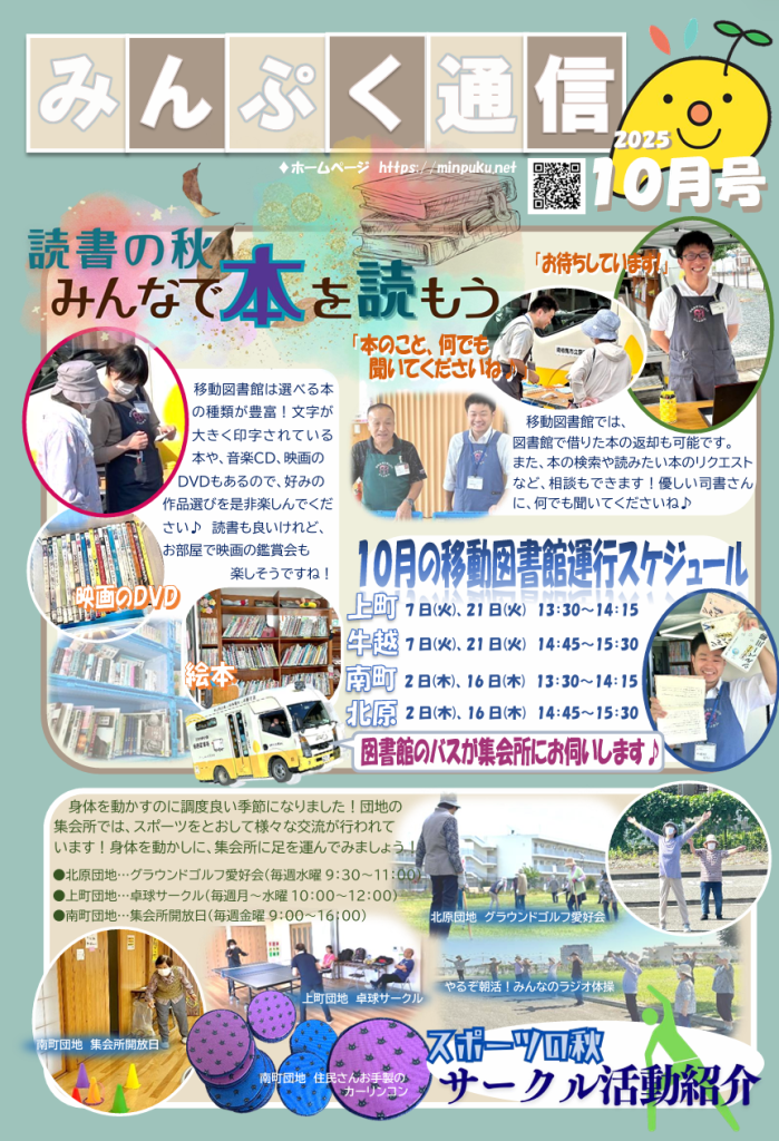 今にも雨が降りそうな曇り空でしたが、集会所には移動図書館を楽しみにしておられた住民さんが集合し、好きな本を探したり、お喋りを楽しむなど、充実したひとときを過ごしておられました。南町団地は近隣にお住まいの方や、ご夫婦、親子でお越しになる方もおり、オープンなイベントとしてすっかり定着しました♪ 北原団地は、グラウンドゴルフ愛好会のメンバーが集うなど、交流の場として欠かせないものとなっています。みんなで集まるきっかけになりますね!