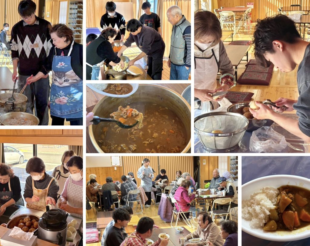 当日は、開始前から役員さんを中心に会場づくりが進められ、福島大学の学生さんが到着する頃には準備万端!大変スムーズなスタートとなりました!また、具材となる野菜やお肉など、切らなくてはいけない食材が山ほどありましたが、料理好きの住民さんが中心となって手際よく作業が進み、何と!材料と調理時間を有効活用して、予定外の豚汁まで出来てしまいました!! お昼近くになると、カレーを楽しみにしていた住民さんが続々と集会所に集まり、カレーライスと豚汁を受け取っておられました♪ 調理が終わっても、カレーを食べながら談笑し、ジャンケン大会も開催されて、参加された方は大満足のご様子!「来年はバーベキューをやりたいね!」など、早くも次回への声が上がっていました! バーベキュー、実現させたいですね!!