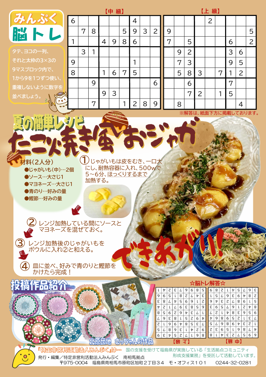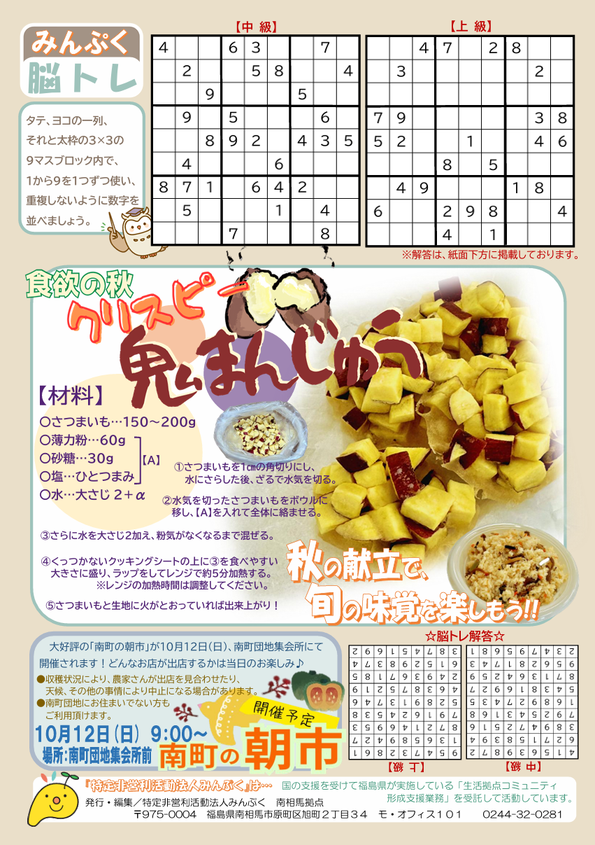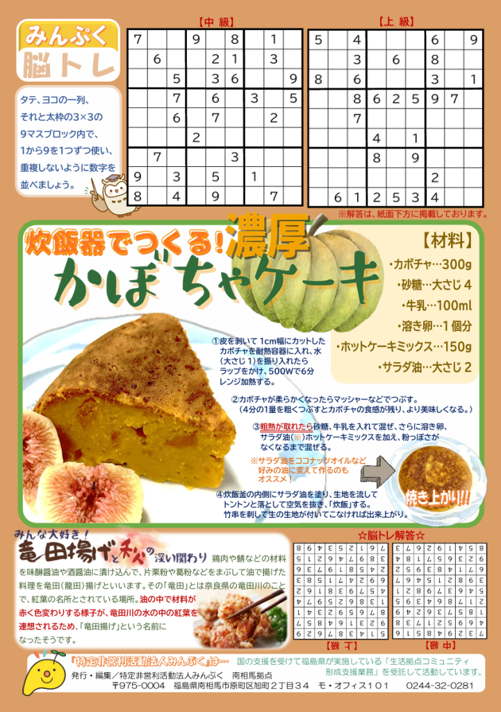 当日は手芸サークルのメンバーを中心に、団地にお住まいのお子さんと親御さんの参加もあり、とても賑やかな雰囲気に包まれました♪更に、手芸サークルメンバーの方が「みんぷく通信10月号」掲載のレシピ《鬼まんじゅう》を作ってきてくださり、今回の交流会はお茶会からのスタート!