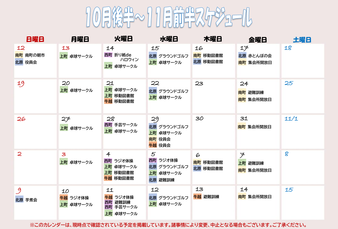 1日目は雨上がりの涼しさの中で、2日目は雲一つない青空のもと、秋の空気を楽しみながらのラジオ体操となり、心地良く身体を動かすことが出来ました!中には、ラジオ体操が終わってそのまま集会所での卓球サークルに参加もいるなど、身体を動かすことに積極的な住民さんもおり、朝から活気のある上町団地の様子が伺えました。また次回、皆さんで集まりましょう!