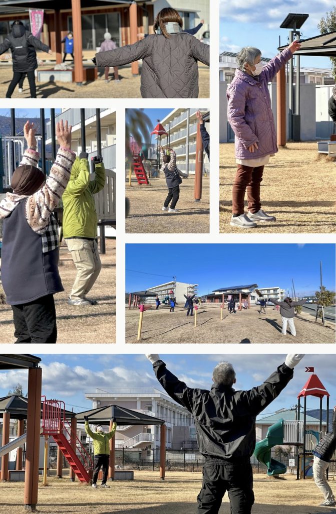 どちらも寒さが厳しい朝となりましたが、早めの時間にたくさんの住民さんが集まり、開始前からお喋りが弾んでいました!「寒い寒い!」という声があちこちから聞こえてきますが、体操が始まると防寒着のモコモコ感に負けないくらいしっかりと身体を動かしておられ、体操が終わる頃には何だか身体がほぐれている様子♪そのまま仲良しグループで朝散歩に出かける方が多くいらっしゃいました!