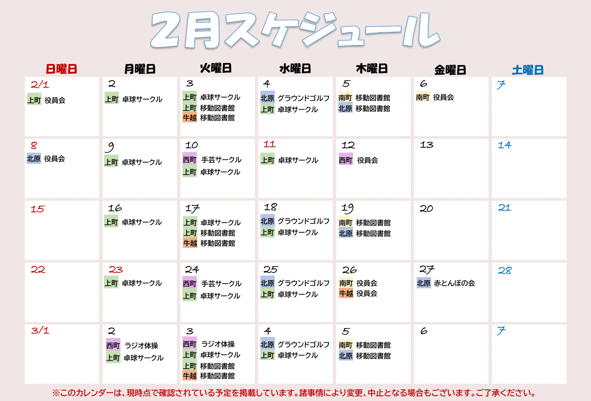 冬の間は屋外での活動をお休みしているグラウンドゴルフ愛好会ですが、この日は屋内活動でもフルメンバーが出席!健康を気遣い、運動大好きなメンバーの皆さんは、今日も元気に集まりました!そして今回は、ラジオ体操で身体を動かした後、『頭の体操』を行うことに…♪難問ばかりの「いじわるクイズ」は遊び心も大切ということで、お喋りしながら取り組みますが、なかなか手強かったようです。「答えははずれたけれど、正解を聞いて頭をスッキリさせることも良い脳トレだと思う!」と、皆さんポジティブに楽しんでおられました。後半は、懐かしの歌のイントロクイズを行い、答えるだけでなく、皆で歌って盛り上がりました!歌うとなんだか晴れやかな気持ちになりますね! 来週もみんなで集まりましょう!